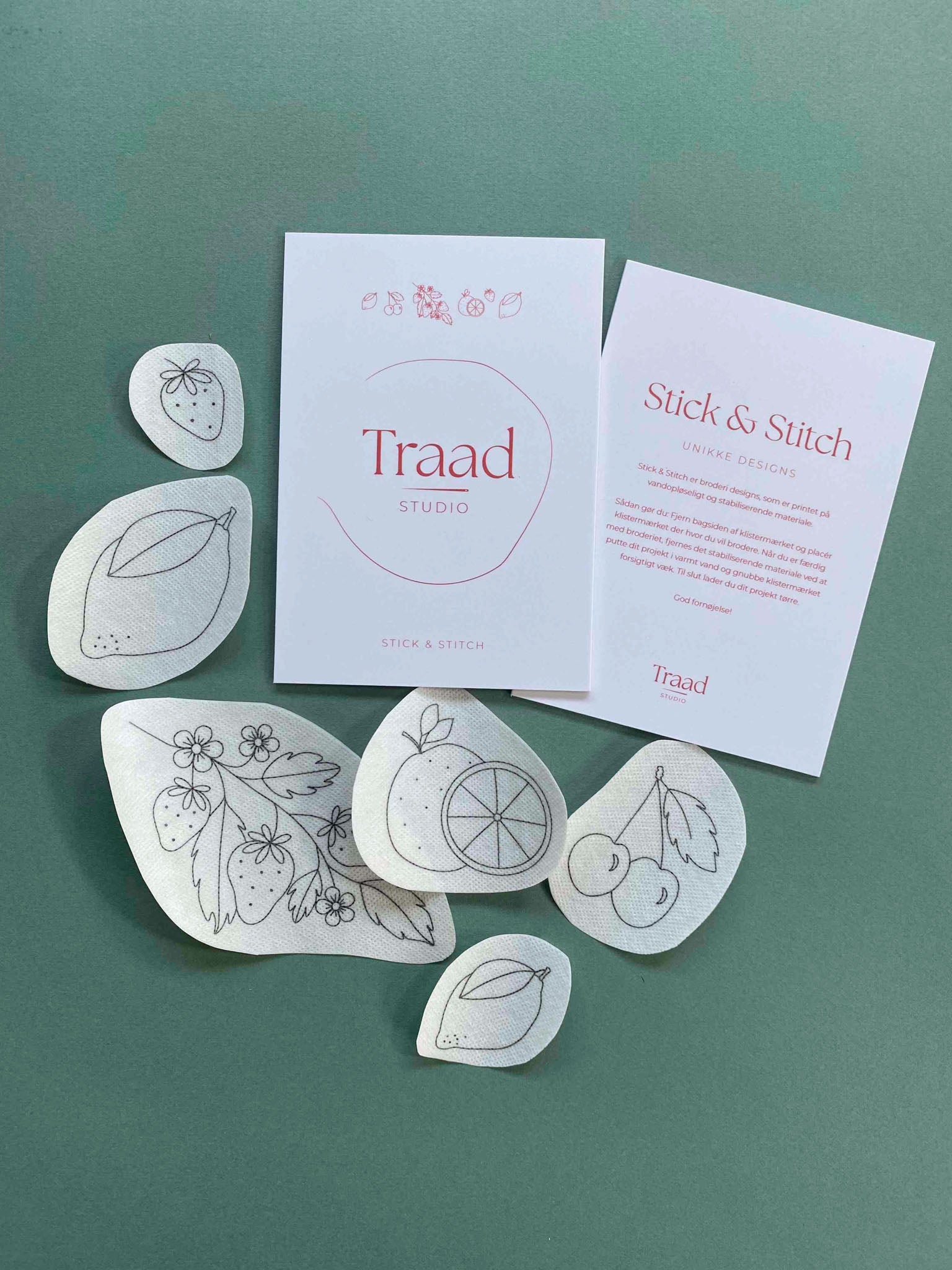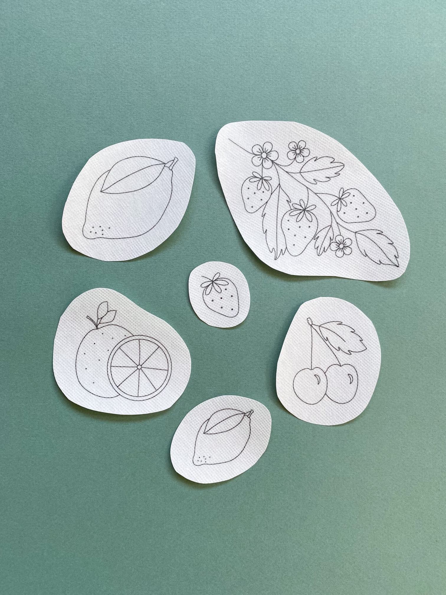 Denne Stick & Stitch pakke indeholder 6 broderimotiver, en stingtegning til hver mønster og QR koder til video guides af de sting som bruges i pakken. De 6 Stick & Stitch broderimotiver er printet på Sticky Solvy Fabri fra Solvy, som er overførtbart materiale, så motiverne kan overføres og broderes direkte på det stof du ønsker. Motiverne er af følgende: en jordbærgren, et jordbær, en lille citron, en stor citron, appelsiner og kirsebær.