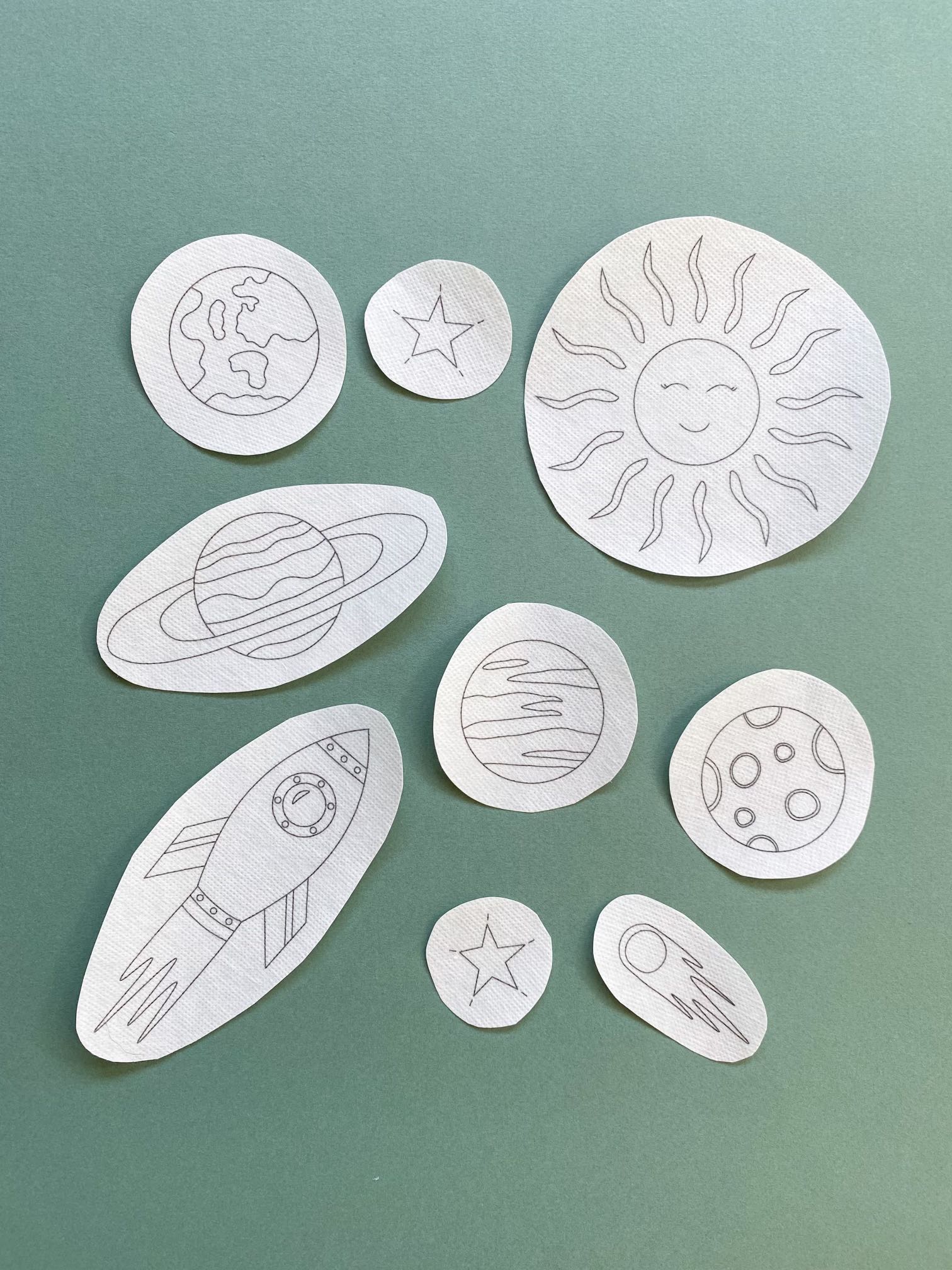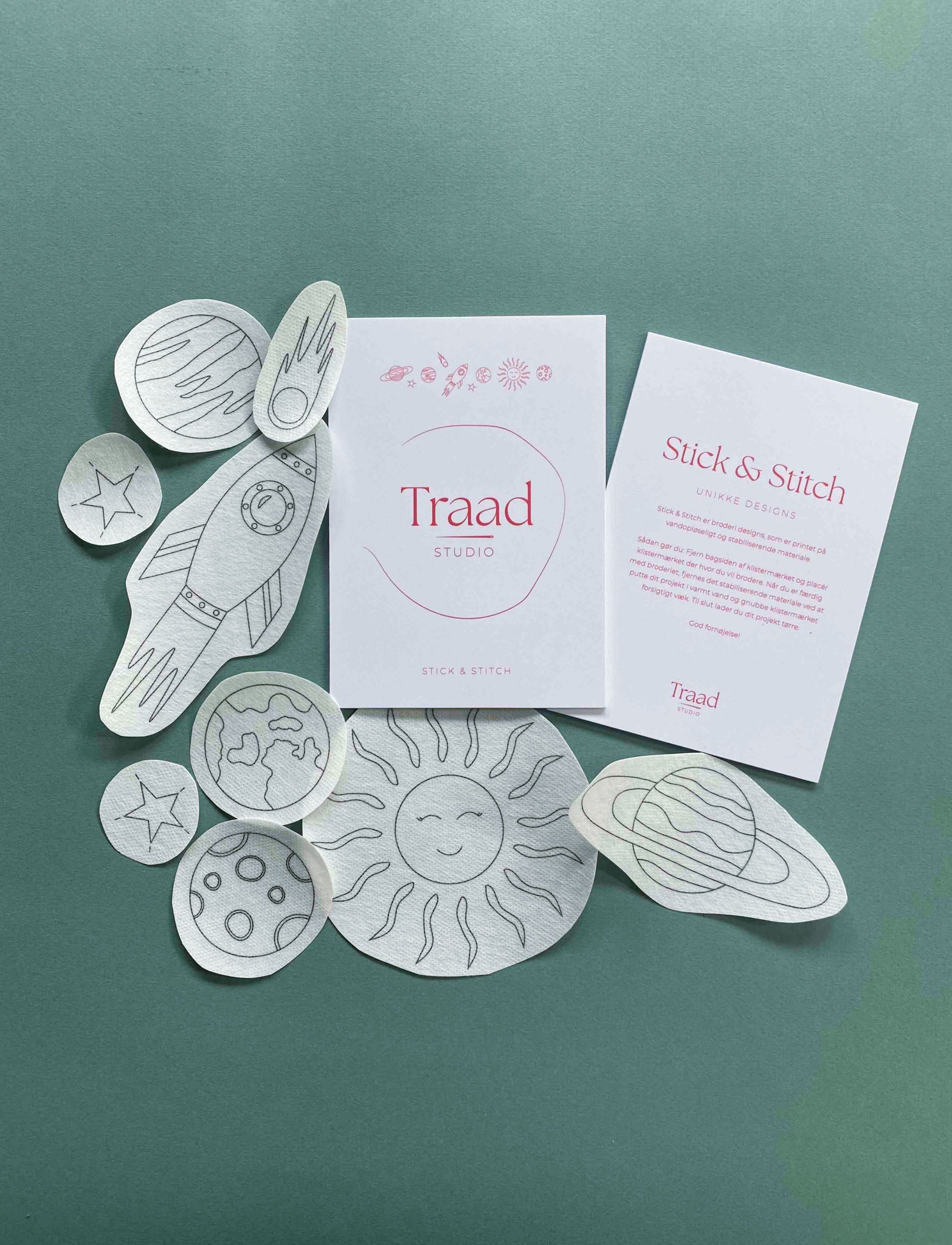 Denne Stick & Stitch pakke indeholder 9 broderimotiver, en stingtegning til hver mønster og QR koder til video guides af de sting som bruges i pakken. De 9 Stick & Stitch broderimotiver er printet på Sticky Solvy Fabri fra Solvy, som er overførtbart materiale, så motiverne kan overføres og broderes direkte på det stof du ønsker. Motiverne er af følgende: Månen, jorden, saturn, jupiter, en rumraket, solen, 2 x en stjerne og en asteroide.